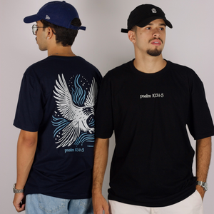 Com um design marcante, traz um desenho detalhado de uma águia nas costas, simbolizando a renovação das forças que vem do Senhor. Na frente, a referência bíblica destaca essa promessa de fé e esperança.