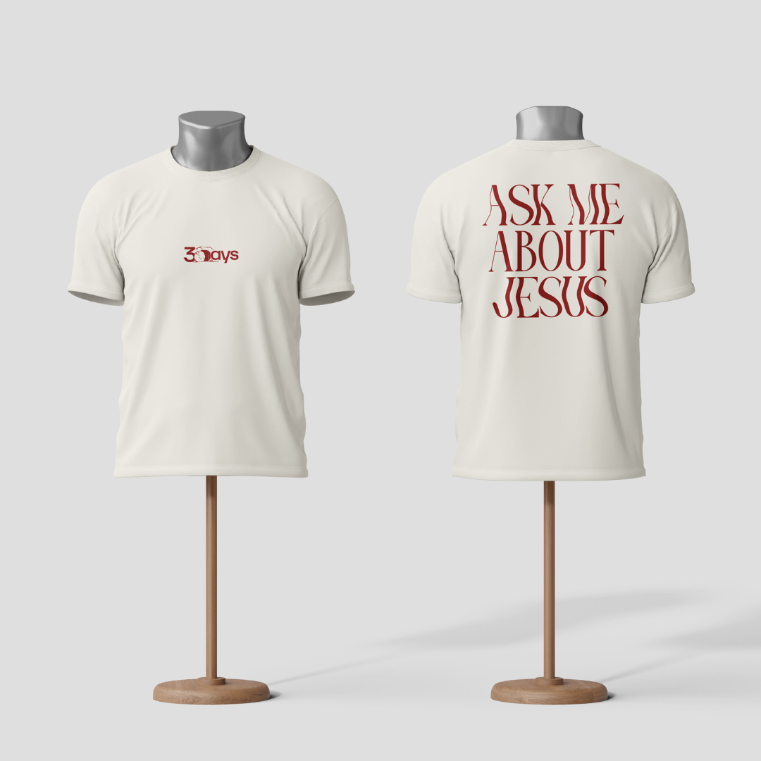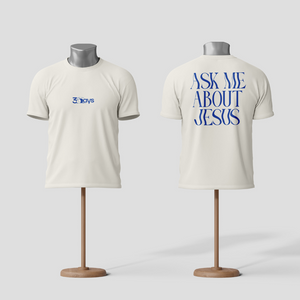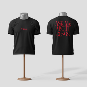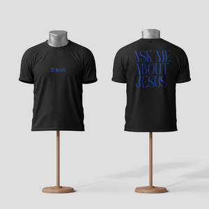 Uma peça evangelística para quem deseja espalhar a mensagem de Cristo de forma autêntica e impactante. Na frente, nossa logo "3DAYS", representando a ressurreição e a vida. Nas costas, a frase "Me pergunte sobre Jesus" em destaque, convidando conversas e testemunhos sobre a fé.